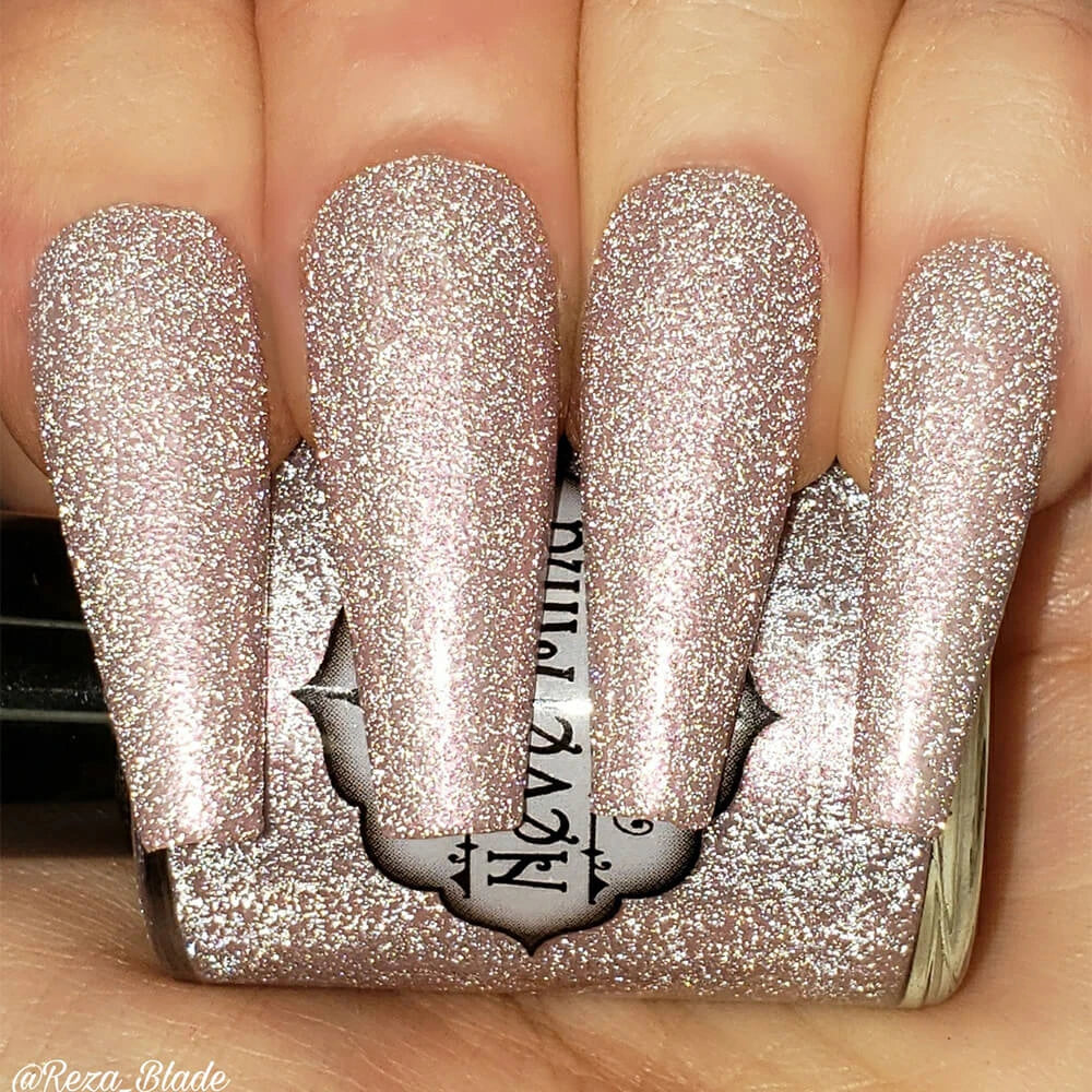 A close-up image of long coffin shaped fingernails painted with a light pink nail polish, featuring a reflective glitter finish.
