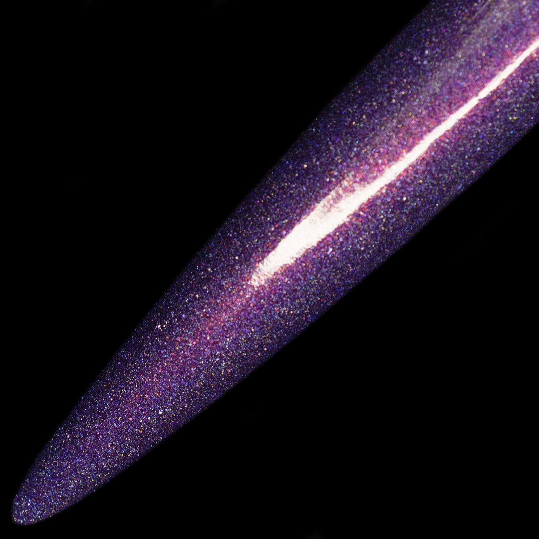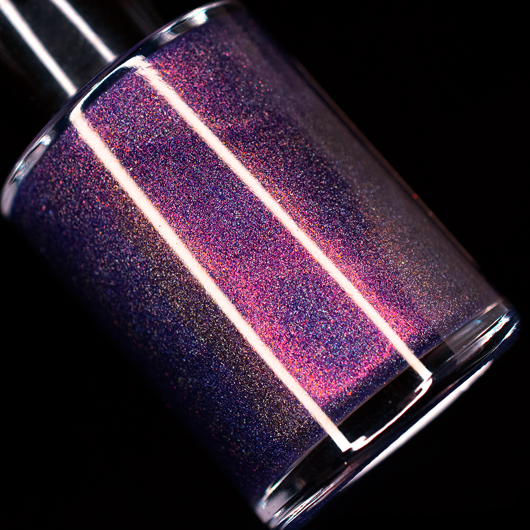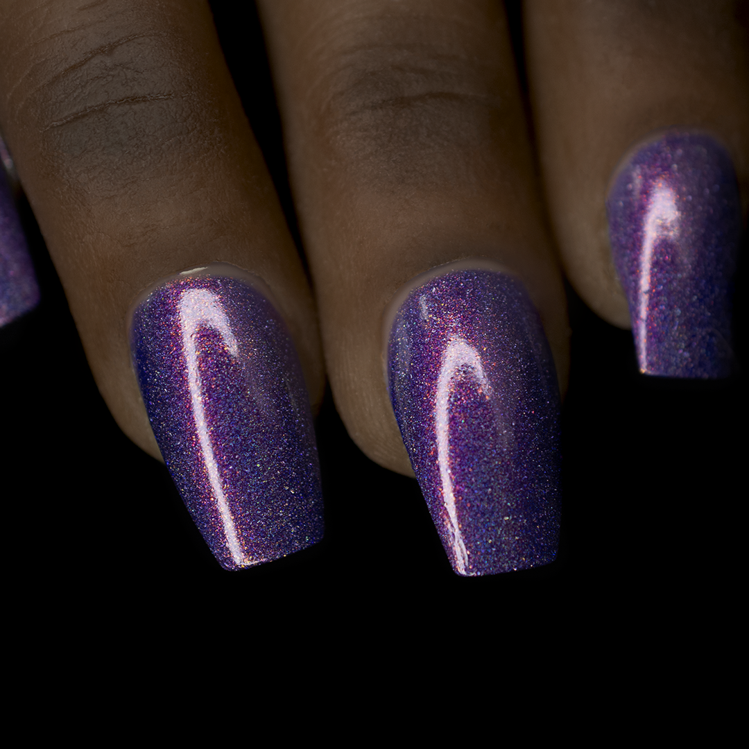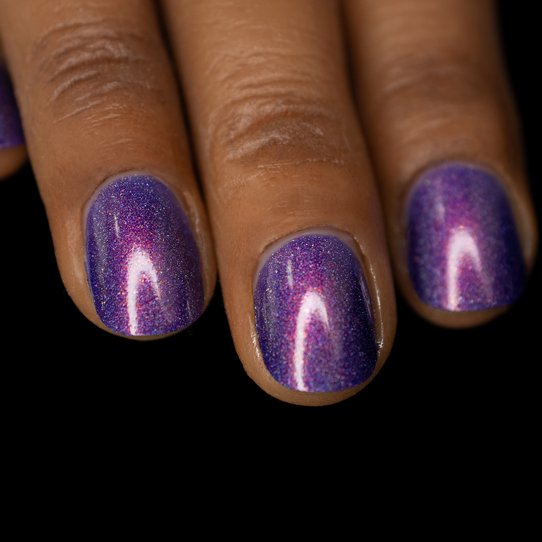 Soulmates, a nail polish that celebrates the magic of unbreakable bonds. This deep violet purple hue is bursting with holographic micro flakes, casting a celestial sparkle that mirrors the stars. While a vibrant pink shimmer dances in the light and shifts to a warm gold at certain angles.